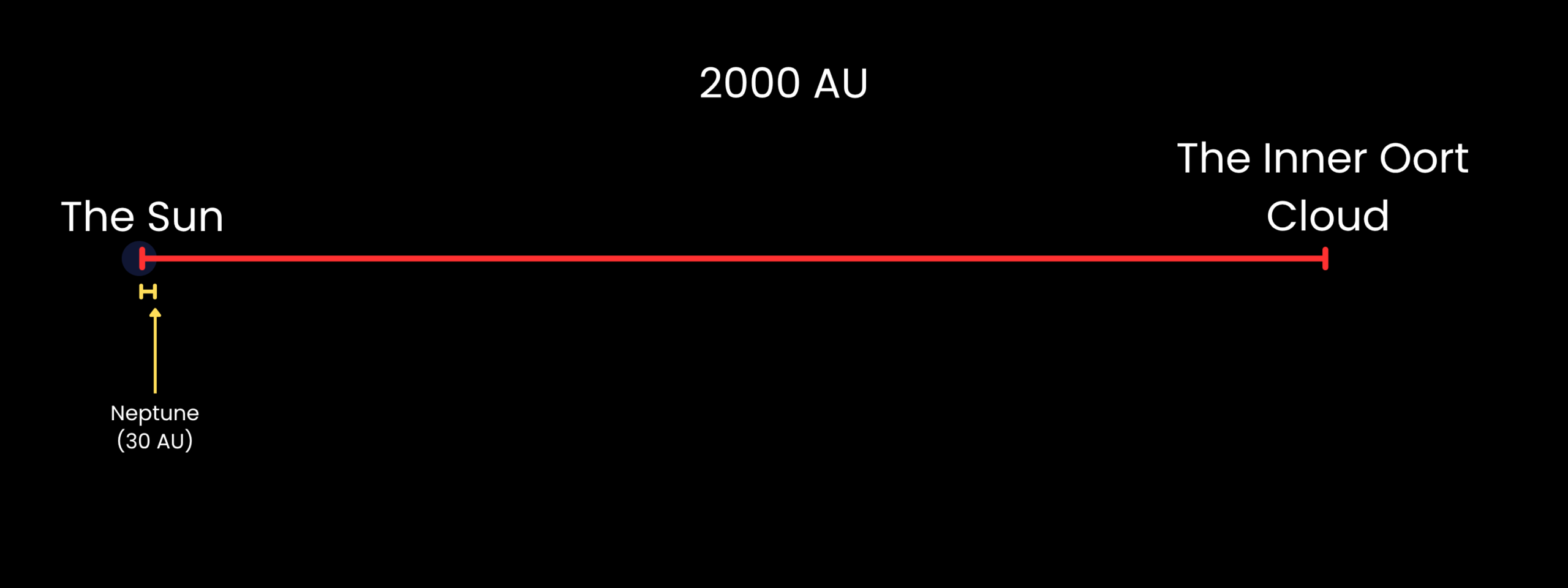 Astronomers often place the beginning of the Inner Oort Cloud at around 2,000 astronomical units from the Sun, where planetary gravity no longer dominates orbital behavior.